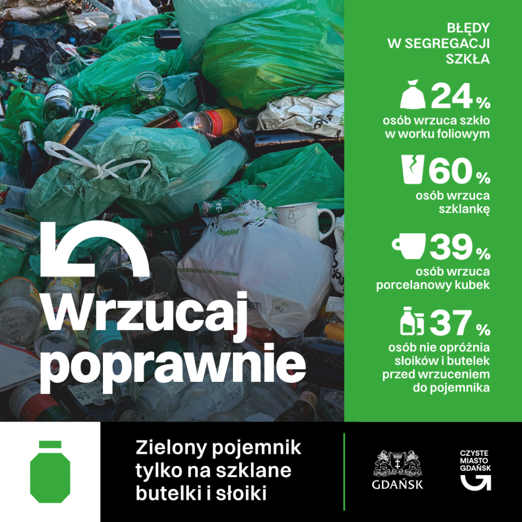 Czy wiesz, że aż 24% z nas wciąż wrzuca szkło w plastikowych workach, a co trzecia osoba zapomina opróżnić słoik z zawartości przed jego wyrzuceniem? Kolejna odsłona kampanii edukacyjnej Wrzucaj poprawnie, przygotowanej przez Czyste Miasto Gdańsk, zwraca uwagę na to, jak prawidłowo segregować szkło oraz jakie błędy popełniamy najczęściej, przez co ten wartościowy surowiec traci możliwość recyklingu. Kampania podkreśla również, że właściwe postępowanie z odpadami ma kluczowe znaczenie dla jakości odzyskiwanego materiału, ochrony środowiska oraz kosztów ponoszonych przez społeczeństwo.